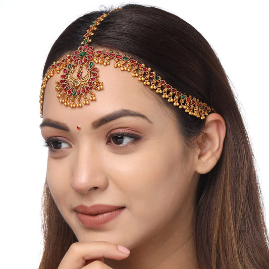 Head Chain For Women Gold Toned Bridal layered Beaded Traditional Mathapatti For Women and Girls (Gold 5)