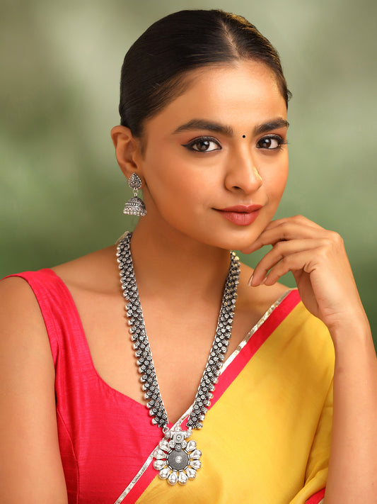 Jewellery Set for Women's and Girls Traditional Silver Oxidised Jewellery Set Silver Necklace Set for Women's | Floral Charm Long Oxidized Necklace Set | Birthday