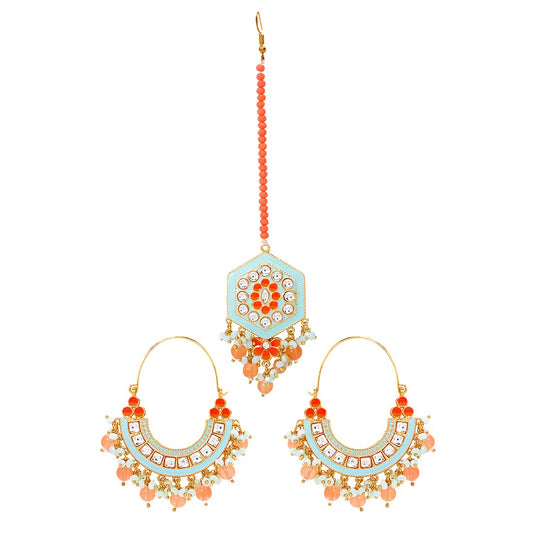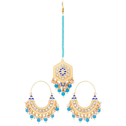 Ethnic Gold Plated Traditional Studded Stone Beads Blue Meenakari Chandbali Earrings with Maangtikka for Women and Girls, Medium (YCTJER-108CNDMGT-BL)