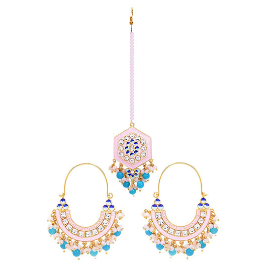 Ethnic Gold Plated Traditional Studded Stone Blue Beads Pink Meenakari Chandbali Earrings with Maangtikka for Women and Girls, Medium (YCTJER-108CNDMGT-PK)