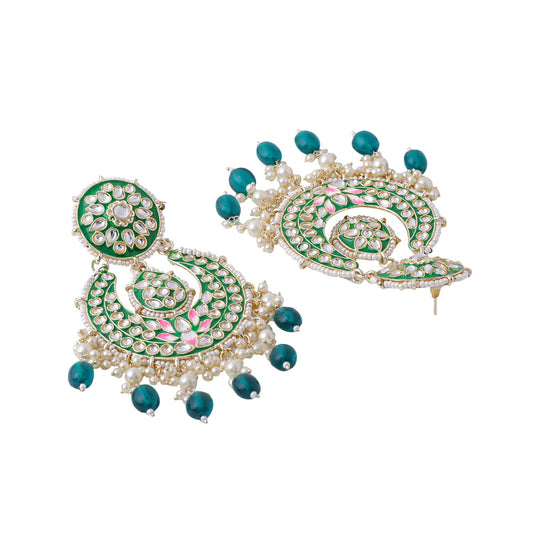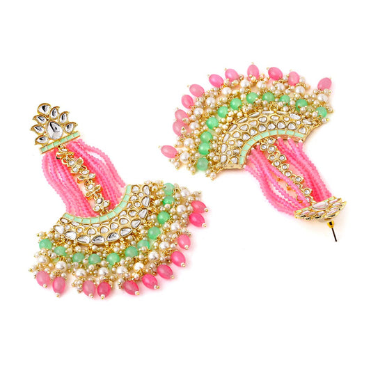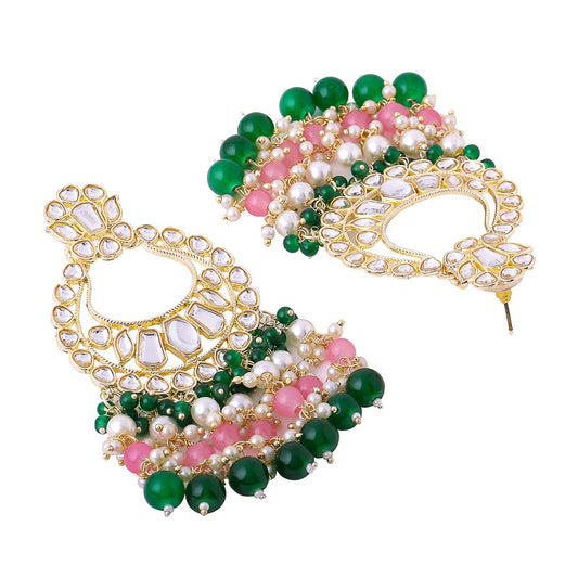 Earrings for Women Gold Toned Kundan Studded Green and Pink Beads Drop Chandbali Earrings for Women and Girls