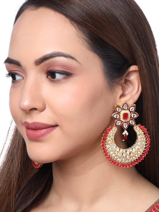 Earrings For Women Gold Tone White and Red Kundan Studded Chandbali Earrings For Women and Girls
