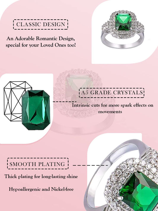 Rings for Women and Girls | Green and White Crystal Studded Ring | Cocktail Style Manmade Emerald Green Crystal Rings | Silver Tone Finger Ring| Square Shaped Finger Ring for Women | Accessories Jewellery for Women | Birthday Gift for Girls