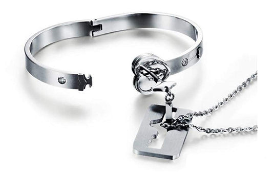 Couple Bracelet Set for Women Engraved Lock and Key Stainless Steel Couple Bracelet Pendant Necklace Set for Men and Women