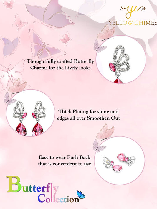 Earrings for Women & Girls | Fashion Sparkling Pink & White Crystal Drop| Silver Toned Butterfly Shaped Western Drop Earrings | Birthday Gifts For Women Valentine Gift for Girls Girls
