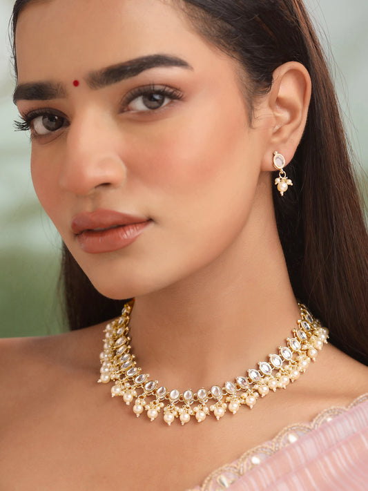 Latest Fashion Designer Crystal Pearl Gold Plated Pearl Necklace Set with Earrings Jewellery Set For Women & Girls