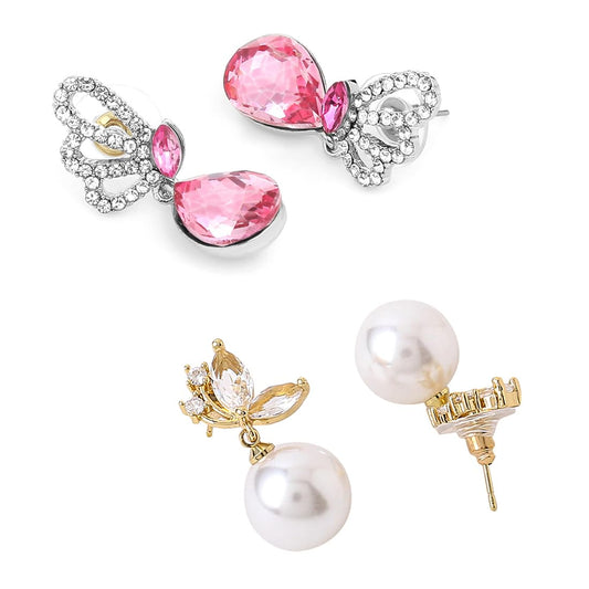 Earrings for Women | 2 Pair Combo of Butterfly Designed Pearl and Crystal Drop Earrings | Birthday Gift for Girls and Women Anniversary Gift for Wife