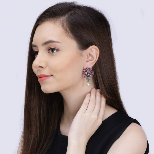 Beautiful Handmade Designer Peacock Carved With Studded Pink Stone Oxidized Silver Plated Drop Earrings for Women and Girls