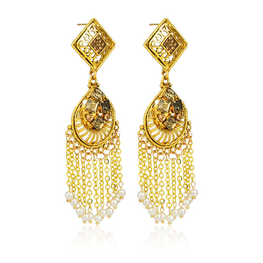 Earrings for Women and Girls Pearl Dangler | Gold Toned Crystal Studded Geometric Designed Long Danglers Earrings | Birthday Gift for girls and women Anniversary Gift for Wife