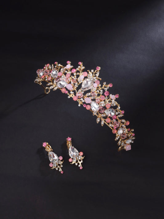 Tiara for Women and Girls Gold Plated Crown With Earrings for Women Multicolor Crystal Studded Bridal Wedding Crown Tiaras for Women Birthday Gifts For Women Valentine Gift for Girls