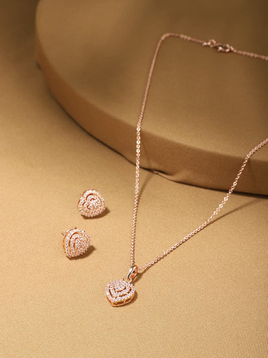 Pendant Set for Women Rose Gold Toned AD/American Dimaond Crytal Studded Multilayer Heart Shaped Pendant Set with Earrings for Women and Girls Valentine Gift for Girls