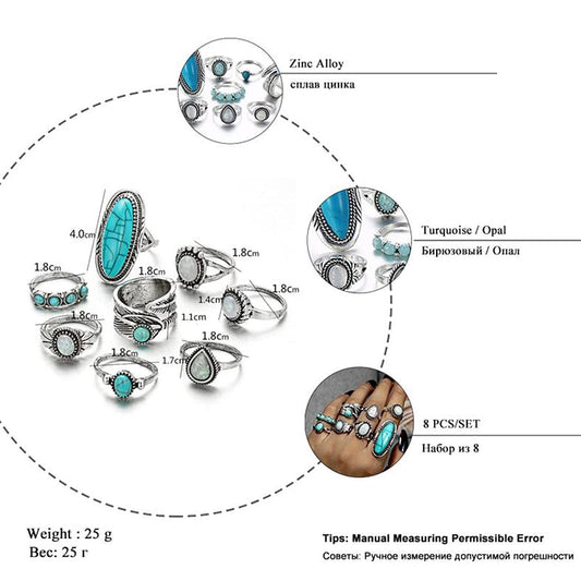 Rings for Women and Girls Fashion Aesthetic Blue Ring Set Oxidised Silver Toned Aesthetic Rings Turquoise Stone Midi Finger 8 PCS Knuckle Rings Set | Birthday Gift For Girls & Women