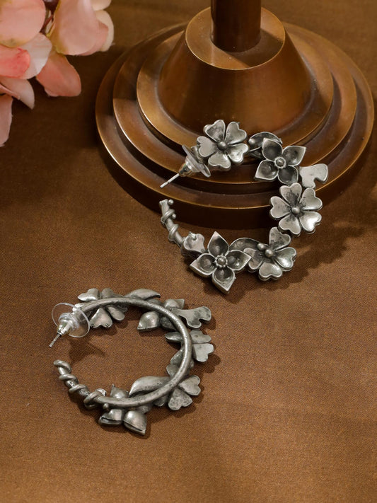 Silver Oxidised Hoops Earrings for Women Girls | Floral Shaped Traditional Silver Oxidised Plated Hoop Earrings | Eternal Elegance | Birthday Anniversary Gift For Girls Women