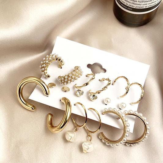Combo: Gold Toned 9 Pair Earrings for Women - Studs & Hoops | 5.5 cm/0.8 cm | Gift Ready | Gold