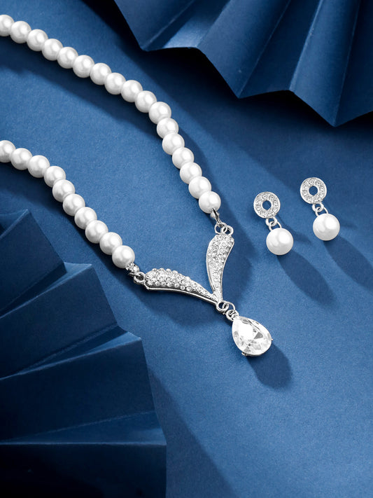Jewellery Set for Women and Girls Fashion White Pearl Necklace Set for Women | Silver Toned CZ Pearl Necklace Set | Birthday Gift for girls and women Anniversary Gift for Wife