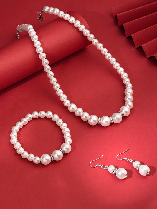 White Pearl Necklace Set with Bracelet & Earrings Pearl Jewellery Set for Women (Silver,White) (YCFJNS-221PERL-WH)