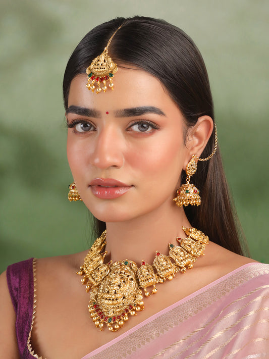 Jewellery Set for Women Gold Plated Traditional Temple Jewellery Set Antique Necklace Set with Earrings and Maangtikka for Women and Girls