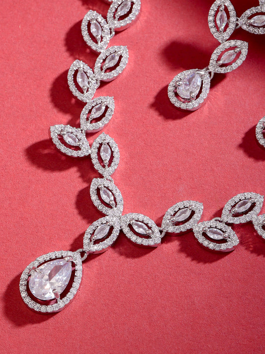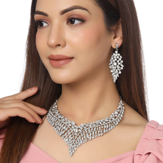 American Diamond Necklace Set For Women | White Stone Silver Jewellery Set For Women | Leafy Shaped Diamond Necklace Set | Birthday Gift for Girls Anniversary Gift for Wife