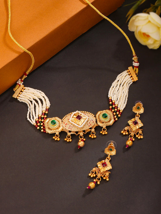 Ethnic Gold Plated Jewellery Set: Choker & Earrings | Adjustable | Gold