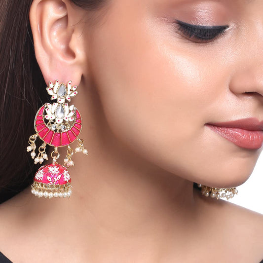 Jhumka Earrings for Women Gold Plated Traditional Pink Meenakari Lotus Chandbali Jhumka Earrings for Women and Girls