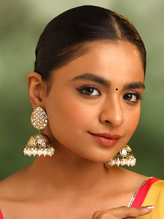 Jhumka Earrings: Traditional Gold Plated with Pearls | One Size | Gold