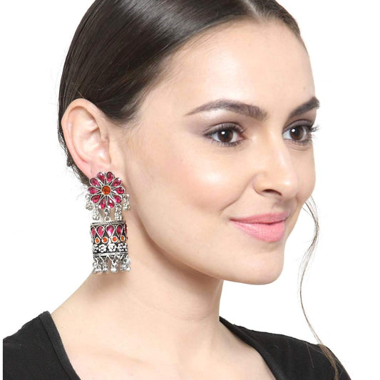 Earrings for Women and Girls | Traditional Pink Studded Stone Silver Oxidised Jhumka | German Silver toned | Birthday Gift For Girls and Women Anniversary Gift for Wife