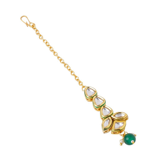 Maangtikka for Women Gold Toned Kundan Studded Floral Designed Green Beads Drop Maangtikka for Women and Girls