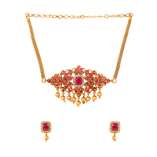 Ethnic Gold Plated Studded Kundan Beads Flower Design Jewellery Set Multicolour Meenakari Choker Necklace Set for Women and Girls (Design 1)