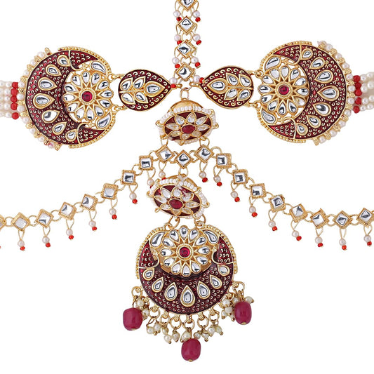 Maangtikka Daamini for Women Gold Plated Kundan Studded Meenakari Touch Multilayer White Beads Chain Designed Daamini Maangtikka for Women and Girls