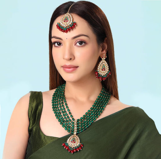 Jewellery Set Green Beads Floral Charm Kundan Studded Beads Drop Neckalce Set with Earrings & Maangtikka for Women and Girls
