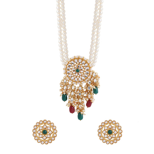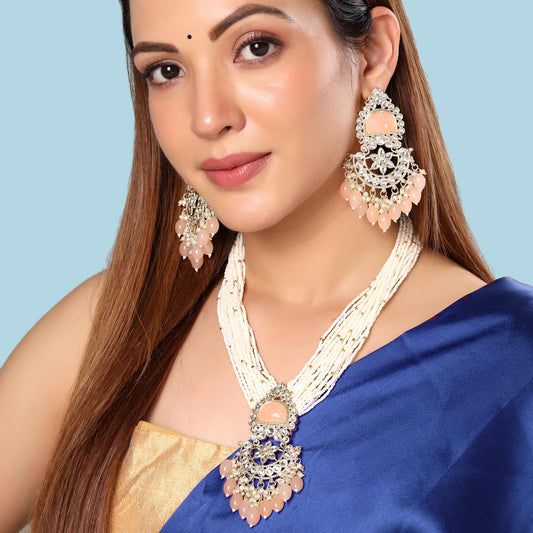 Traditional Long Mala Gold Plated Moti Kundan Necklace Set with Earrings Jewellery Set for Women and Girls