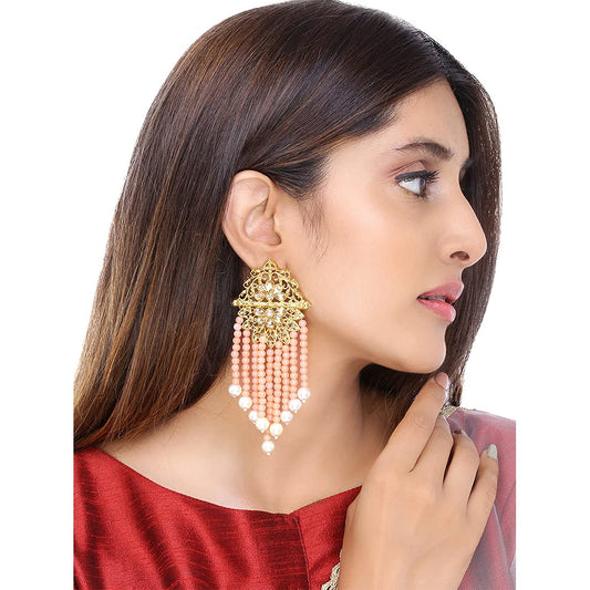 Ethnic Gold Plated Kundan Studded Peach Pearl Dangler Earrings for Women and Girls, Peach, Gold, Medium (YCTJER-82KUDHNG-PCH)