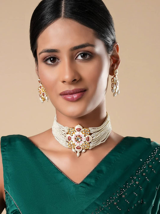 Jewellery Set for Women Gold Toned Kundan Studded Pearl Drop with Beads White Meeanakari Touch Choker Necklace Set with Earrings for Women and Girls