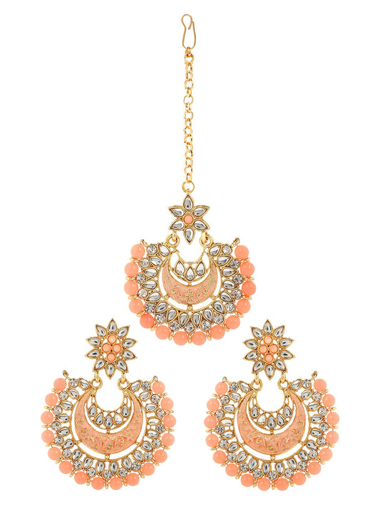 Ethnic Gold Plated Traditional Studded Kundan Peach Pearl Chandbali Earrings with Maangtikka for Women and Girls, Medium (YCTJER-07FLWBDS-PCH)