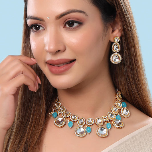 Jewellery Set for Women and Girls Kundan Necklace Set Gold Plated Kundan Studded Blue Beads Drop Choker Necklace Set | Birthday Gift for girls and women Anniversary Gift for Wife