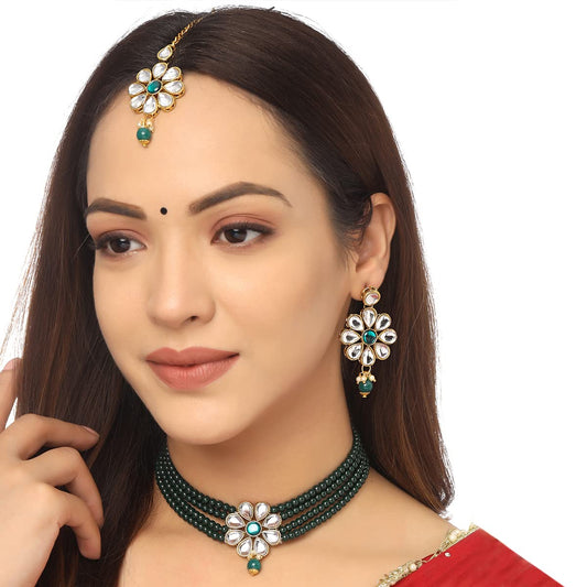 Traditional Jewellery Set for Women Kundan Green Beads Jewellery Set Gold Plated Traditional Choker Necklace Set with Maang Tikka for Women and Girls.