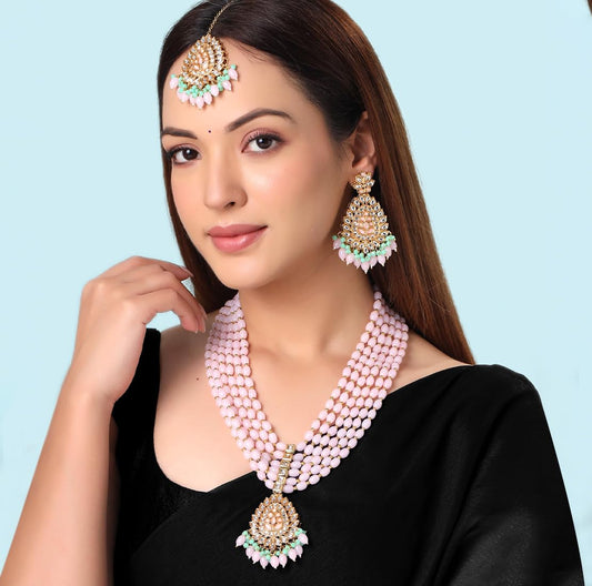 Jewellery Set For Women Multilayered Pink Beads Necklace Set Traditional Gold Plated Long Necklace Set I Ethnic Kundan Beads Birthday Gift for Girls & Women Anniversary Gift for Wife