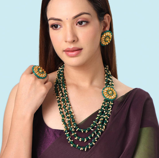 Jewellery Set For Women Multilayered Green Beads Necklace Set Traditional Gold Plated Long Necklace Set I Ethnic Kundan Beads Birthday Gift for Girls & Women Anniversary Gift for Wife