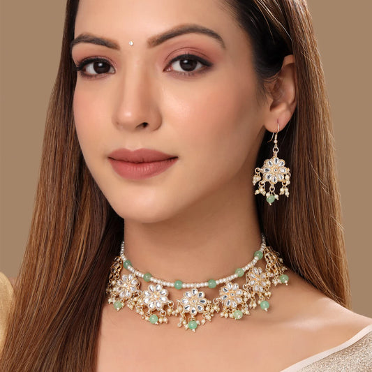Jewellery Set for Women and Girls Kundan Necklace Set | Gold Plated Green Beads Studded Kundan Choker Necklace Set | Birthday Gift for girls and women Anniversary Gift for Wife