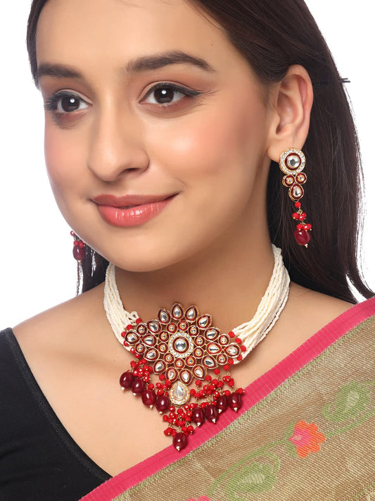 Jewellery Set for Women | Traditional Red Kundan Beads Choker Necklace Set | Ethnic Gold Plated Choker Set for Girls Birthday Gift for Girls & Women Anniversary Gift for Wife