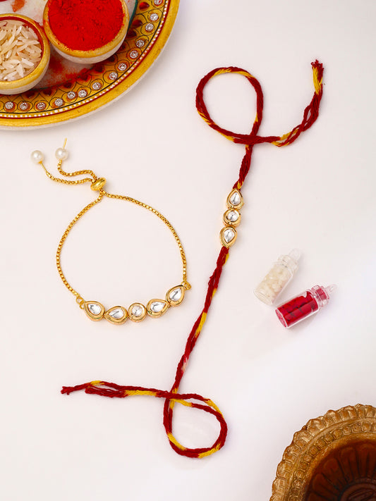 Rakhi for Brother and Bhabhi Gold Plated Kundan Bhaiya Bhabhi Rakhi Set Handmade Dori Worked Rakhi Combo of 2 PCs Men Rakhi Bracelet With Roli & Chawal