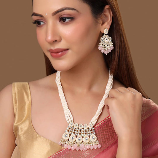 Jewellery Set For Women Multilayered Pink Beads Necklace Set Traditional Gold Plated Long Necklace Set I Ethnic Kundan Beads Birthday Gift for Girls & Women Anniversary Gift for Wife