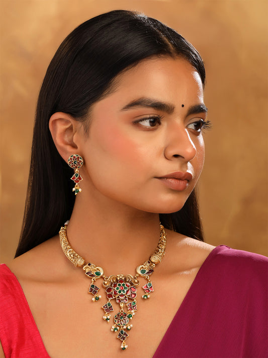 Temple Jewellery Set: Gold Plated Meenakari Necklace Set | Adjustable | One Size | Gold