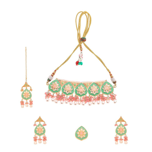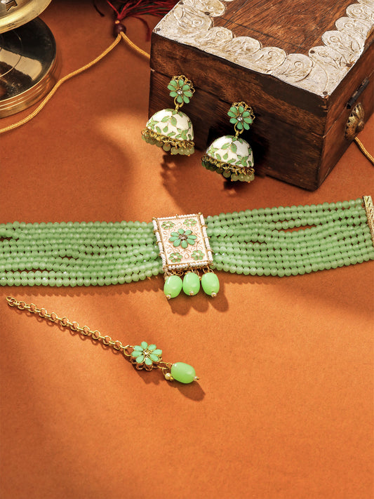 Jewellery Set for Women | Traditional Green Beads Choker Necklace Set Gold Plated Choker Set for Girls Meenakari Worked Necklace Set Birthday Gift for Girls & Women