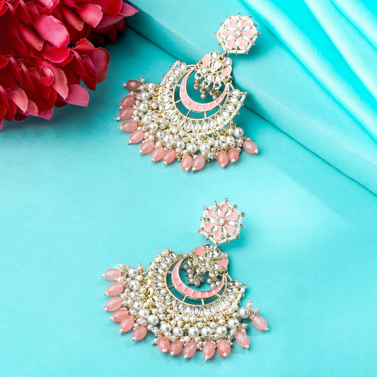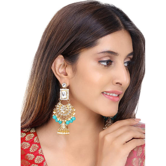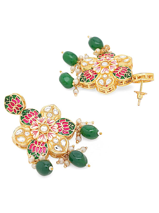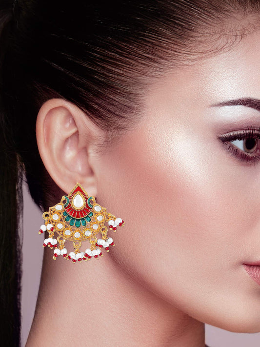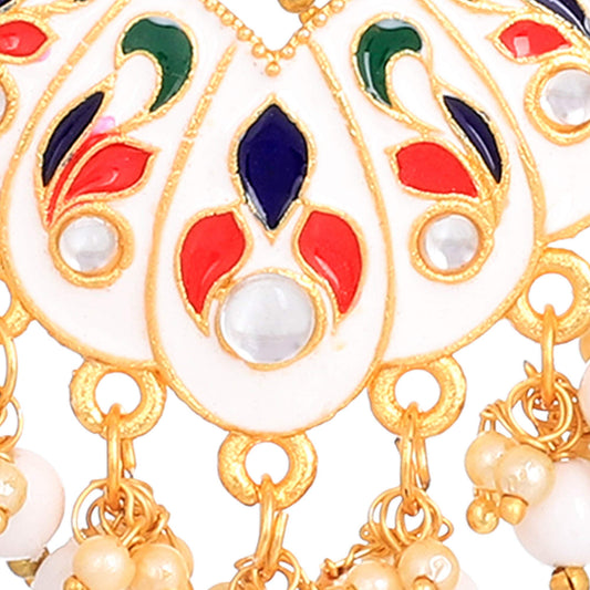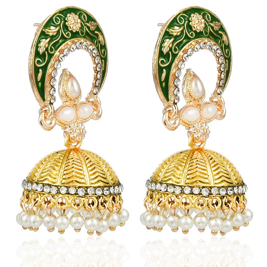 Ethnic Gold Plated Kundan Studded Meenakari Pearl Beads Chandbali Jhumka Earrings for Women and Girls