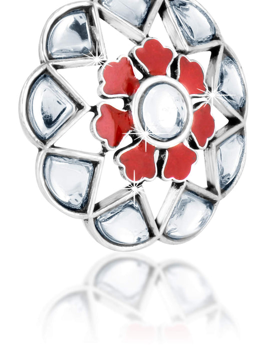 Antique Handmade Design Floral Theme Meenakari Touch Kundan Studded Oxidised Silver Stud Earrings for Women and Girls (Red)