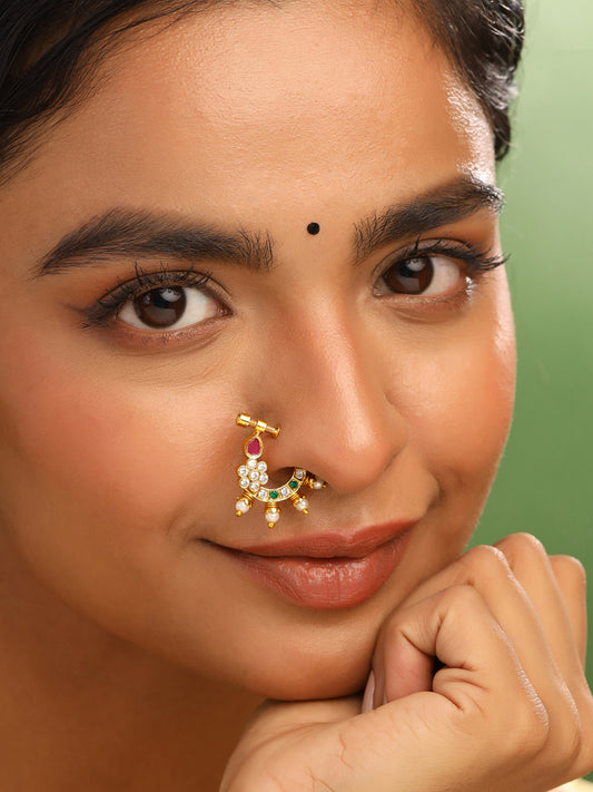 Combo of 2: Traditional Golden AD Nose Pins with Multicolor Stones | Non-Piercing | 2.5cm | Gold