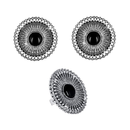 Earrings and Ring for Women and Girls | Traditional Silver Oxidised Studs and Rings Set | German Silver Earrings Set | Floral Shaped Jewellery set | Accessories Jewellery for Women | Birthday Gift for Girls and Women Anniversary Gift for