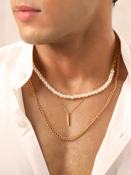 Layered Pearl Necklace: Gold Stainless Steel Chain for Men | 64.5cm | Elegant Fashion Accessory