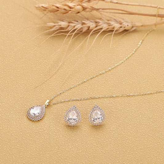 Gold Plated Pendant Set: White Stone Necklace with A5 Crystals | Includes Drop Earrings | One Size | Gold